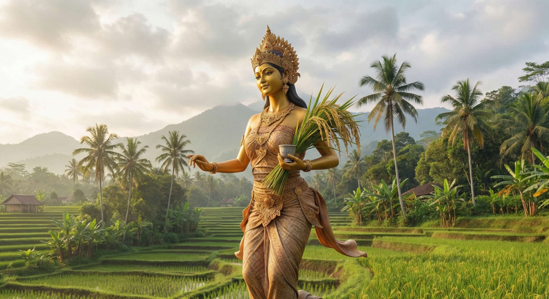Dewi Sri is the rice and fertility goddess in Javanese and Balinese traditions. Originating from pre-Hindu indigenous beliefs, she represents nourishment, prosperity, and harmony between humans and nature. In rural Indonesia, offerings are still made in rice fields to honor her spirit and ensure a successful harvest.
