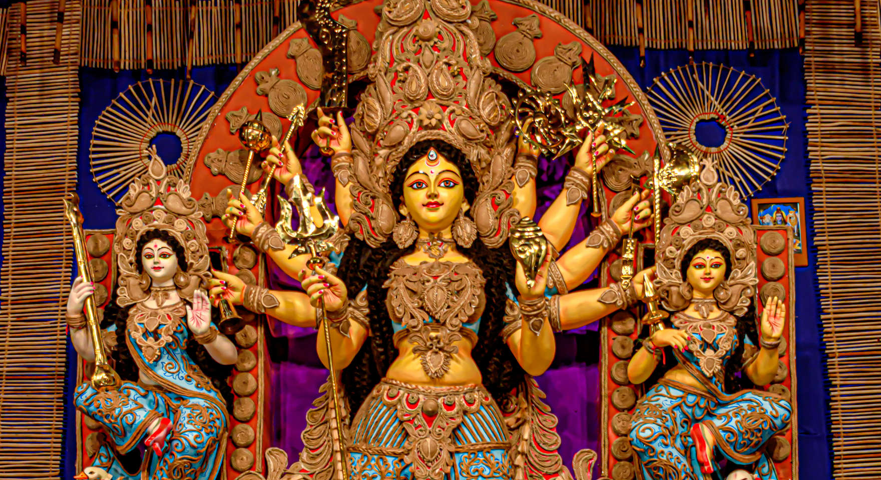 Durga represents divine strength and protection. She is typically depicted riding a lion or tiger while defeating the demon Mahishasura. As a warrior goddess, she symbolizes the triumph of good over evil and is especially revered during the festival of Navaratri.