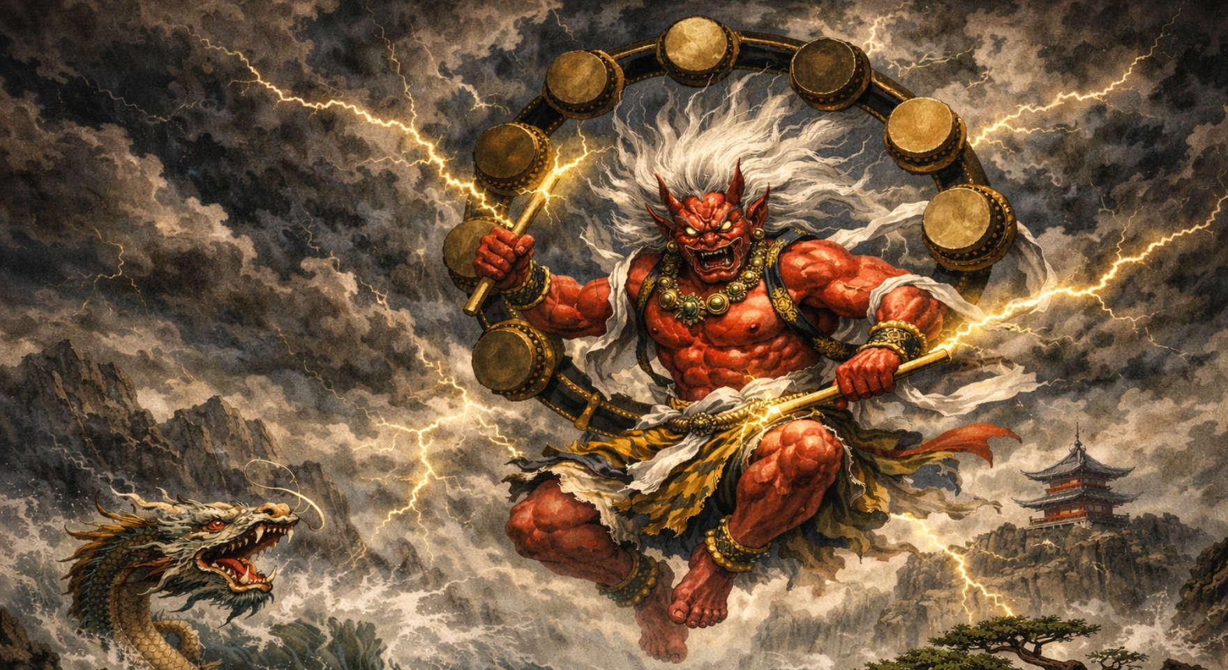 Raijin is the Shinto god of thunder and lightning. He is commonly depicted beating large drums to create thunderclaps. While storms can be destructive, rain is essential for crops, making Raijin both a feared and respected force of nature. He is frequently portrayed alongside Fujin, the wind god, in Japanese art and temple iconography.