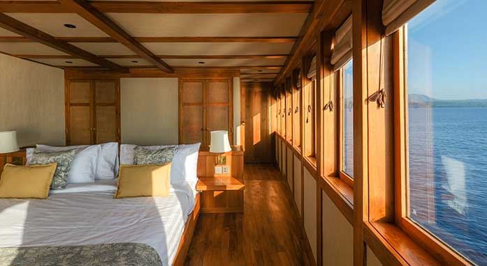 The Master Stateroom aboard Celestia is located in a commanding position on the main deck, looking back across the stern of the yacht. With large wraparound windows, the Master Stateroom enjoys lots of natural light and incredible views of the seascapes and islands as you cruise Indonesia. The largest of Celestia’s cabins and fitted with a king-bed, at 39sqm the Master Stateroom comfortably sleeps up to 2 guests. Positioned to enjoy the best views, this stateroom also has a private terrace and sundeck that looks aft, offering uninterrupted views of the marine scenery. Independently air-conditioned, the stateroom also has a private en-suite bathroom with walk-in shower , heated toilet seat and electronic bidet.The Deluxe Staterooms (4 cabins)